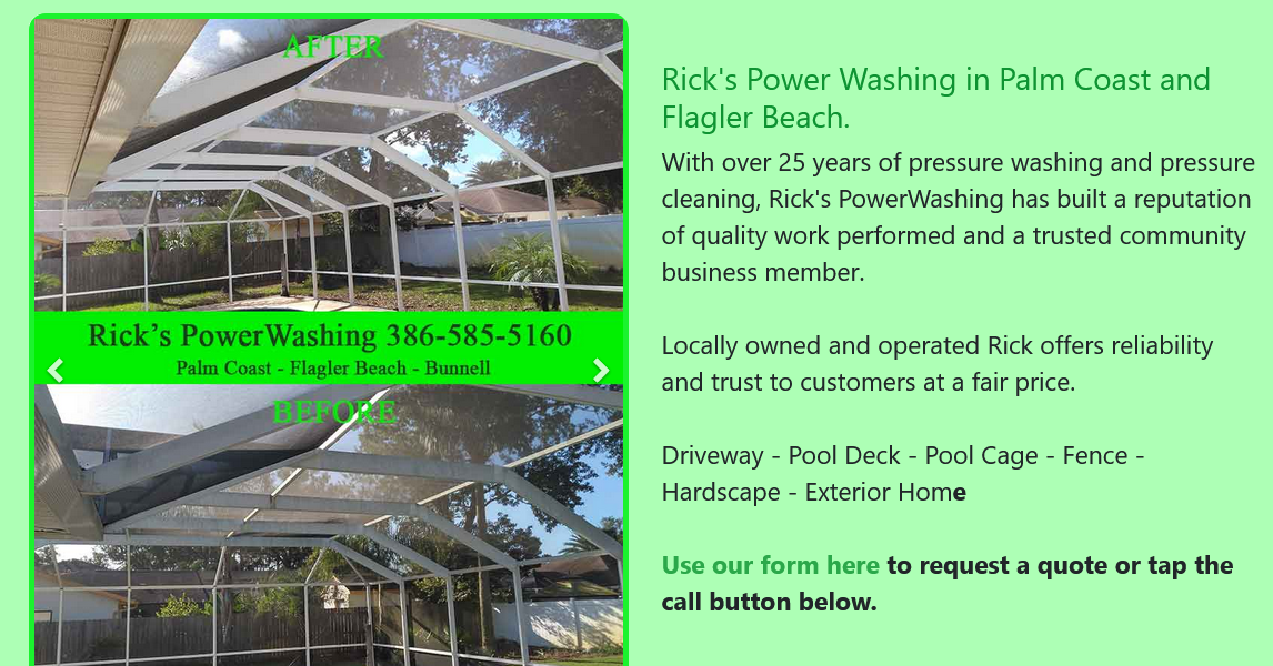 Rick's Power Washing is a locally owned business in Palm Coast and Flagler County, Florida. Driveway Pressure Washing & Other Concrete Pressure Washing, Whole House and Commercial Property, with exterior pressure washing services with quality service at a fair price.